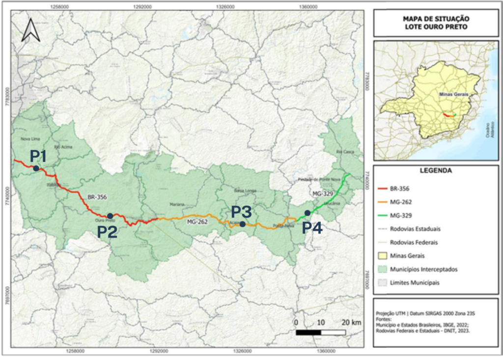 O lote rodoviário Ouro Preto abrange 190,1 quilômetros das rodovias BR-356, MG-262 e MG-329, consideradas estratégicas para o turismo, a mobilidade regional e a logística em Minas Gerais.